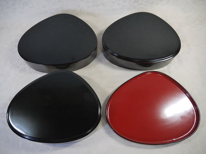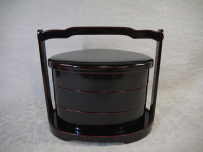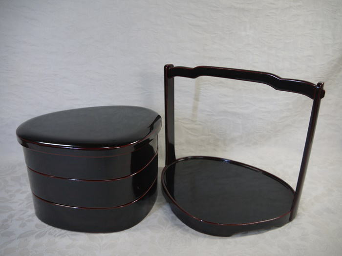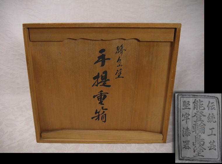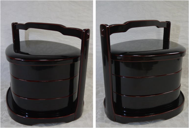 伝統工芸 能登輪島塗 縁起の良い蛤形の三段の手提げ重箱です。 傷汚れ使用感なく状態良好な美品です。 「能登輪島塗 堅牢漆器」の判が押された和紙は破れ汚れがあります。 共箱入(うっすらシミ汚れがあります) 重箱の横最大22cm 縦最大18cm 重箱の全体の高さ14.5cm 台の底面横最大24.5cm 縦最大20cm 持ち手を入れた全体の高さ22cm 在庫なし