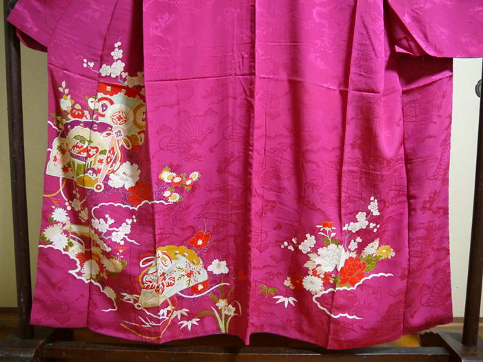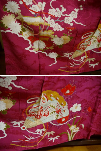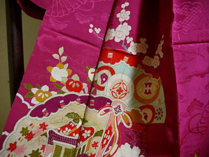 裾には牡丹・菊・椿・蘭・橘・御所車・扇・吉祥文などが色とりどりの美しい色使いでが豪華絢爛に描かれています。