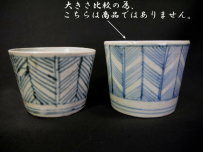 古伊万里 蕎麦猪口 矢羽根文 天明様式 小ぶりでぐい飲みに丁度良いサイズです。 ニュウ銀補修有り、 その他には傷なく水漏れなし。 口径6.8cm H5.1cm 最後の画像は大きさ比較のために一般的なサイズの矢羽根文と 並べた画像で右側は商品ではありません。 在庫なし